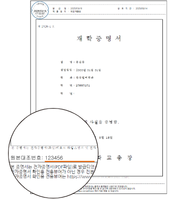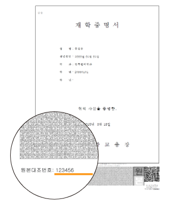 예) 증명서 하단 - 원본대조번호: 123456